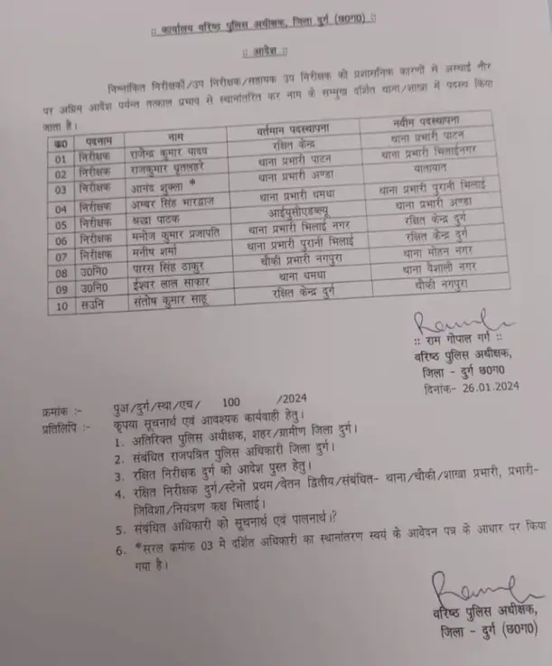 दुर्ग : दुर्ग जिले में लंबे समय से एक ही स्थान पर पदस्थ कई थाना प्रभारियों का ट्रांसफर किया गया है,वरिष्ठ पुलिस अधीक्षक दुर्ग राम गोपाल गर्ग ने इस बाबत आदेश जारी कर दिया है, जिसमें सात टीआई सहित दो एसआई और एक सहायक उप निरीक्षक का नाम शामिल है।
