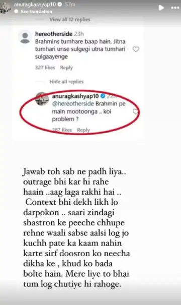 जब उनके पोस्ट पर बरसते हुए एक यूजर ने लिखा कि 'ब्राह्मण तुम्हारे बाप हैं। जितना तुम्हारी उनसे सुलगेगी, उतना तुम्हारी सुलगाएंगे'। तो इसी पर रिएक्ट करते हुए अनुराग कश्यप ने वो आपत्तिजनक टिप्पणी कर दी थी जिसपर हंगामा मचा हुआ है।