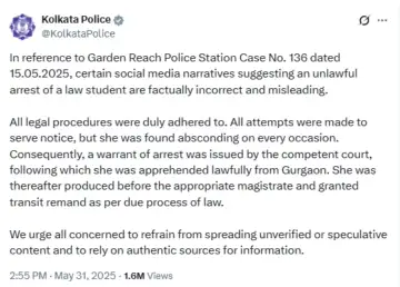 30 मई को कोलकाता पुलिस ने गुरुग्राम में शर्मिष्ठा को ट्रैक किया और उन्हें गिरफ्तार कर लिया. कोलकाता पुलिस ने एक्स पर पोस्ट करते हुए कहा, 'गार्डन रीच पुलिस स्टेशन केस नंबर 136, दिनांक 15.05.2025 के संदर्भ में, कुछ सोशल मीडिया दावे जो एक लॉ स्टूडेंट की गिरफ्तारी को गैरकानूनी बता रहे हैं. लोगों के ऐसे दावे तथ्यात्मक रूप से गलत और भ्रामक हैं.'