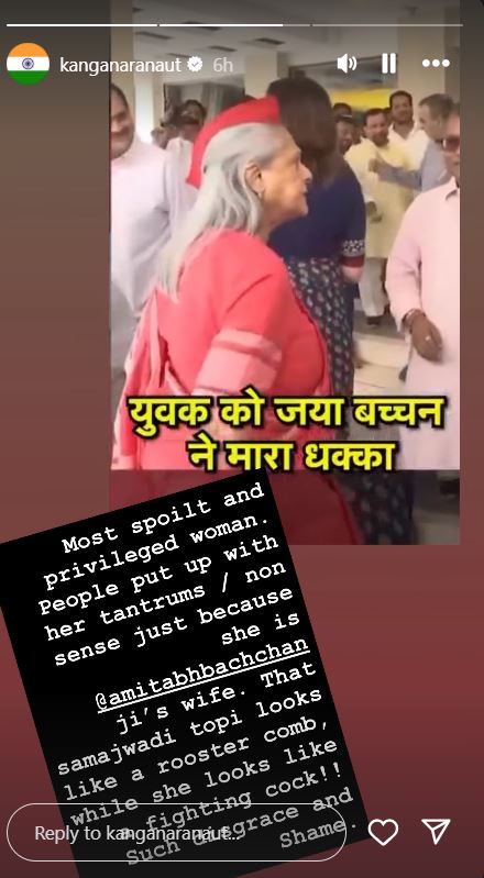 आम आदमी के साथ जया बच्चन के इस बर्ताव की निंदा करते हुए कंगना रनौत ने अपने आधिकारिक इंस्टाग्राम अकाउंट पर एक वीडियो शेयर की। उन्होंने इस वीडियो के साथ कैप्शन में एक्ट्रेस पर भड़कते हुए लिखा, "सबसे बिगड़ैल प्रिविलेज महिला। लोग इनके नखरें झेलते हैं, क्योंकि ये अमिताभ बच्चन की पत्नी हैं"।