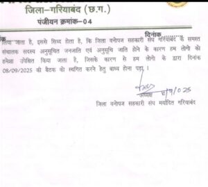 परमेश्वर राजपूत,गरियाबंद : जिला वनोपज सहकारी संघ जिला गरियाबंद के 08/09/2025 को प्रबंध संचालक के द्वारा संचालक मण्डल की बैठक आहुत कि गई थी, जिसमें उप प्रबंध संचालक अतुल श्रीवास्तव द्वारा बैठक एजेण्डा को सुना रहे थे, उसी बीच में हम संचालको द्वारा लक्ष्मण नेताम लेखापाल का स्थानान्तरण आदेश के बारे में पुछा गया तो 16/07/2025 को आदेश जारी होना बताया गया। उप प्रबंध संचालक के द्वारा उक्त आदेश को शिथिल करने कोर्ट में याचिका दायर करना बताया गया, परन्तु आदेश दिनांक और कोर्ट में याचिका दायर करने की तिथि के बीच अन्तर 18-19 दिन होता है। इस अन्तराल अवधि में लेखापाल को भारमुक्त करने हेतु प्रबंध संचालक जिला वनोपज सहकारी संघ गरियाबंद को 29/07/2025 को संचालक मण्डल के द्वारा आवेदन दिया गया, जिसका आज तक कोई जवाब प्रबंध संचालक के द्वारा नही दिया गया।