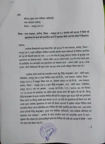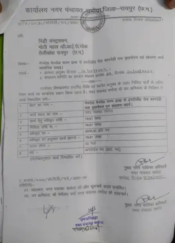 पार्षद विक्रांत सोनकर द्वारा की गई शिकायत के अनुसार, इन दोनों कार्यों का जिम्मा रिद्धि कंस्ट्रक्शन, मोती महल, तेलीबांधा, रायपुर को दिया गया था। नगर पंचायत समोदा द्वारा 12 दिसंबर 2022 को कार्यादेश जारी किया गया था।