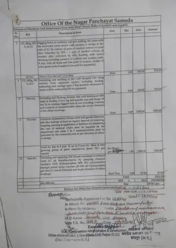 निविदा की शर्तों के मुताबिक, ठेकेदार को 620 पेड़ लगाने थे, लेकिन 10 से 15 पेड़ ही लगाए गए। शेष कार्य कागजों में पूरा दिखाकर भुगतान ले लिया गया। आरोप है कि रिद्धि कंस्ट्रक्शन, मुख्य नगर पालिका अधिकारी, नगर अभियंता और नगर पंचायत समोदा प्रशासक ने आपस में मिलीभगत से वृक्षारोपण की राशि हड़प ली।