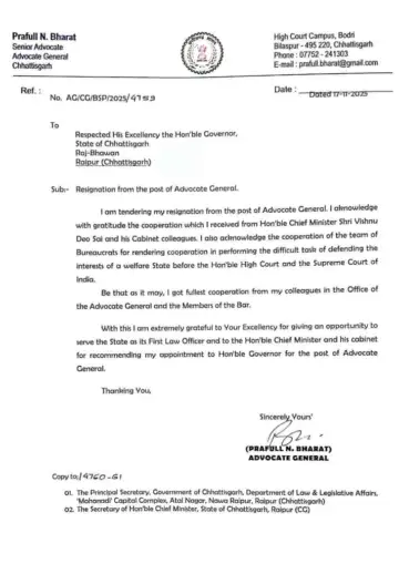 प्रफुल्ल एन भारत ने अपने इस्तीफा पत्र में लिखा है कि मुख्यमंत्री विष्णु देव साय और उनके मंत्रिमंडल के सहयोगियों से मिले सहयोग के लिए मैं कृतज्ञतापूर्वक आभार व्यक्त करता हूं। मैं उच्च न्यायालय और सर्वोच्च न्यायालय के समक्ष कल्याणकारी राज्य के हितों की रक्षा के कठिन कार्य में सहयोग देने के लिए नौकरशाहों की टीम के प्रति भी आभार व्यक्त करता हूं। मुझे महाधिवक्ता कार्यालय के अपने सहयोगियों और बार के सदस्यों से पूरा सहयोग मिला। इसके साथ ही मैं राज्यपाल का भी आभारी हूं कि आपने मुझे राज्य के प्रथम विधि अधिकारी के रूप में सेवा करने का अवसर दिया।