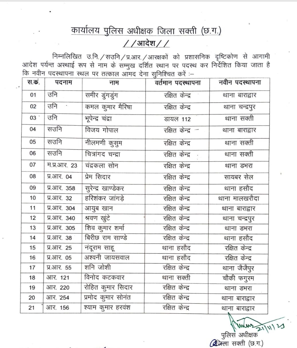 साथ ही जिले के हसौद थाना में पदस्थ प्रधान आरक्षक नंदूराम साहू व अश्वनी जायसवाल ये दोनों को रक्षित केंद्र भेजा गया है ये दोनों के खिलाफ बहुत ही ज्यादा शिकायत थी, सक्ती जिले में प्रफुल्ल ठाकुर तीसरे एसपी के रूप में पदभार संभालने के लगभग एक माह बाद यह पहला आदेश जारी किया गया है। यह ट्रांसफार्मर सूची लंबे समय बाद जारी की गई है। यह कदम कानून व्यवस्था को और मजबूत करने के लिए उठाया गया है, ताकि पुलिस विभाग में कसावट हो और जिले में अच्छे से पुलिसिंग हो सके।तबादले आदेश जारी किए जाने के बाद सभी को अपने अपने स्थानों पर तत्काल पदभार ग्रहण करने कहा गया है।