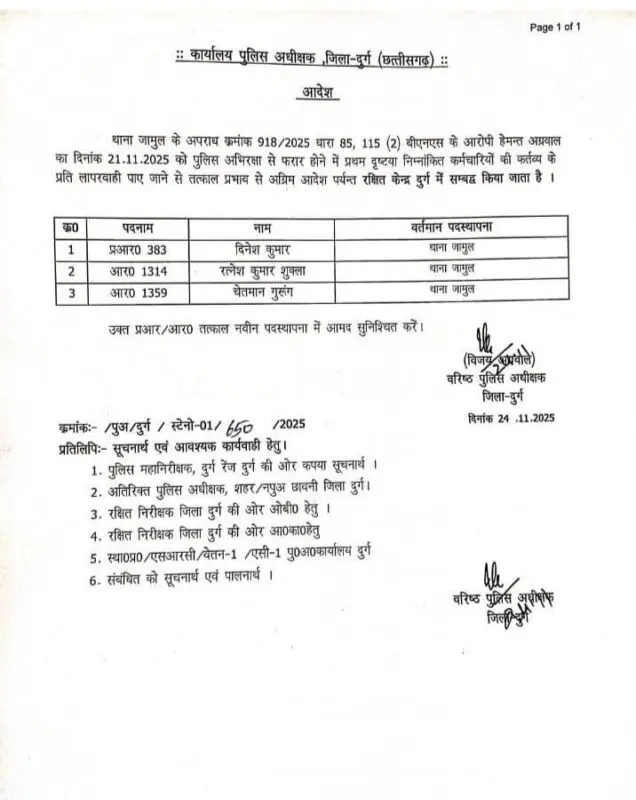 जांच रिपोर्ट मिलने के बाद वरिष्ठ पुलिस अधीक्षक विजय अग्रवाल ने ड्यूटी में लापरवाही बरतने वाले तीन आरक्षकों को तत्काल प्रभाव से नोटिस जारी कर लाइन अटैच कर दिया है। जामुल थाने के प्रधान आरक्षक दिनेश कुमार, आरक्षक रत्नेश कुमार और चेतमान गुरुंग के खिलाफ कार्रवाई से पुलिस महकमे में हड़कंप मच गया है।