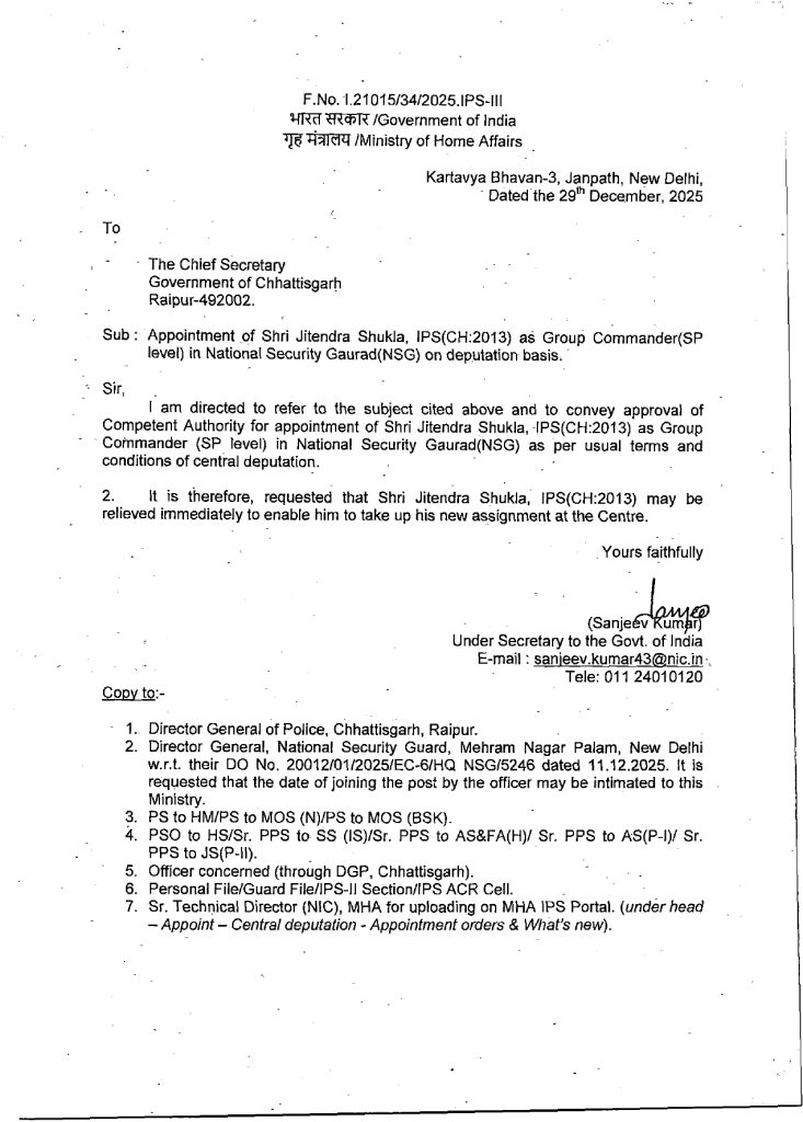 रायपुर: केंद्र सरकार की राष्ट्रीय सुरक्षा गार्ड (NSG) में छत्तीसगढ़ कैडर के 2013 बैच के आईपीएस जितेंद्र शुक्ला को बड़ी जिम्मेदारी दी गई है. उन्हें एनएसजी का ग्रुप कमांडर बनाया गया है. इस संबंध में केंद्रीय गृह मंत्रालय ने छत्तीसगढ़ के मुख्य सचिव विकासशील को आईपीएस जितेंद्र शुक्ला को यथाशीघ्र कार्यमुक्त करने के लिए पत्र भी भेजा है.