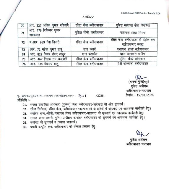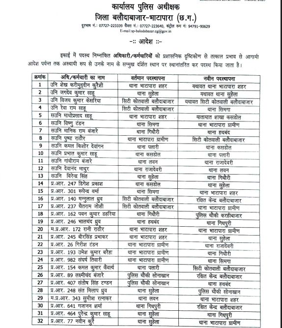 बलौदाबाजार : बलौदाबाजार-भाटापारा जिले के पुलिस विभाग में बड़े पैमाने पर तबादला हुआ है। इस संबंध में एसपी भावना गुप्ता ने आदेश जारी किया है। जारी ट्रांसफर लिस्ट में कुल 76 पुलिसकर्मियों को इधर से उधर किया गया है।तबादला आदेश के अनुसार, 4 उप निरीक्षक, 9 सहायक उप निरीक्षक, 29 प्रधान आरक्षक और 34 आरक्षकों के नाम शामिल हैं।
