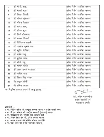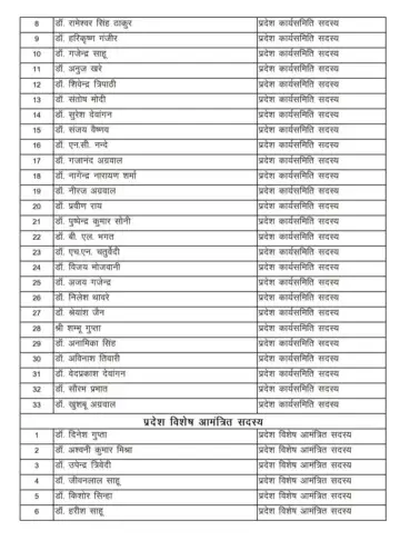 प्रदेश विशेष आमंत्रित सदस्यों की सूची में डॉ.दिनेश गुप्ता, डॉ.अश्वनी कुमार मिश्रा, डॉ. उपेंद्र द्विवेदी, डॉ. जीवनलाल साहू, डॉ. किशोर सिंहा, डॉ. हरीश साहू, डॉ. बी.डी. साहू, डॉ. भारती गुप्ता, डॉ. निलय तिवारी, डॉ. सोमेश कुशवाहा, डॉ. गौतम विश्वास, डॉ. राजेश साहू, डॉ. दीपक गुप्ता, डॉ. निधि श्रीवास्तव, डॉ. रज्जन त्रिपाठी, डॉ. विविजय साहनी, डॉ. आलोक कुमार पाल, डॉ. सुधीर शिशोकर, डॉ. यमक साहू, डॉ. मुकेश यादव, डॉ. बी.पी. यदु, डॉ. मार्सन गजेर, डॉ. अभय कुमार बरनवाल, डॉ. सतीश साव, डॉ. विनय सिंह परमार, अनुपम सोनी एवं रचित परसर को स्थान दिया गया है. जारी आदेश के अनुसार सभी नियुक्तियां तत्काल प्रभाव से लागू होंगी.