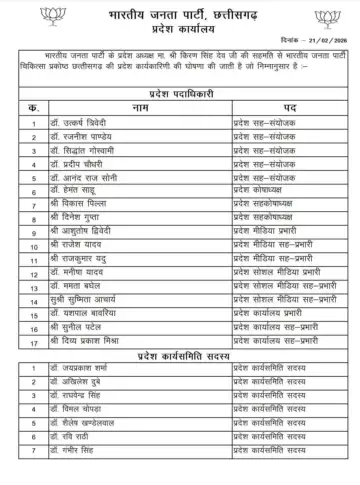 रायपुर : भारतीय जनता पार्टी, छत्तीसगढ़ प्रदेश कार्यालय द्वारा चिकित्सा प्रकोष्ठ की नई प्रदेश कार्यकारिणी की घोषणा की गई है. प्रदेश अध्यक्ष किरण सिंह देव की सहमति से जारी सूची के अनुसार 17 प्रदेश पदाधिकारियों की नियुक्ति की गई है.