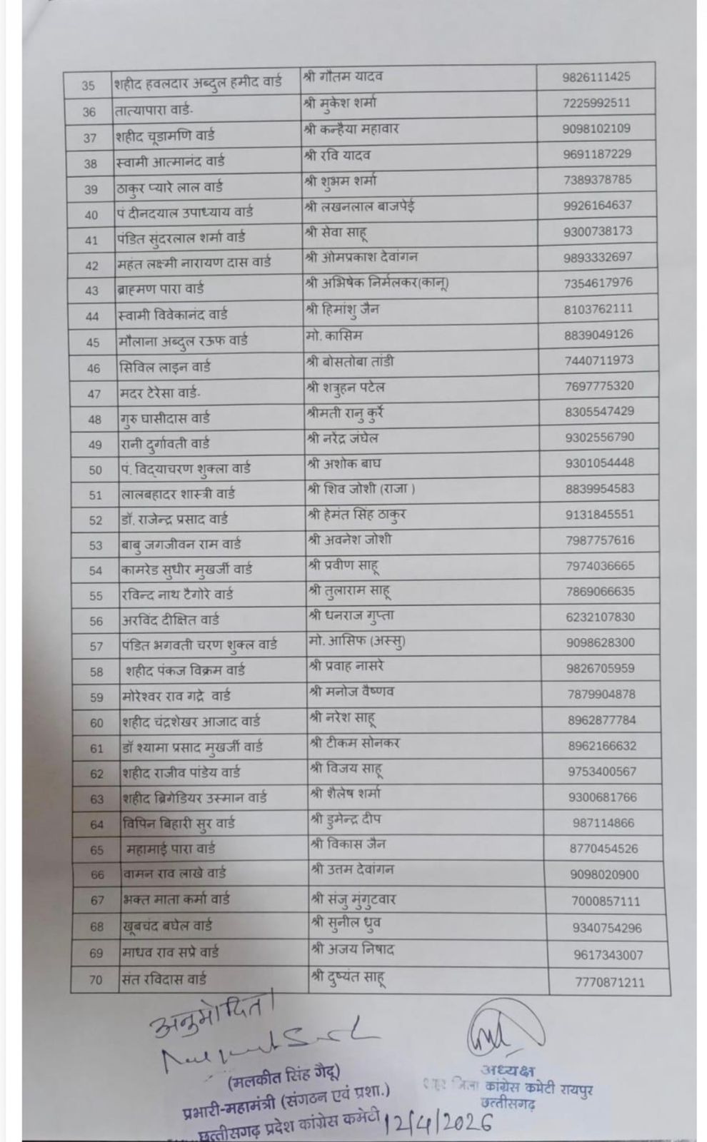 रायपुर: छत्तीसगढ़ प्रदेश कांग्रेस कमेटी के प्रदेश अध्यक्ष दीपक बैज ने रायपुर शहर जिला कांग्रेस कमेटी के 70 वार्ड अध्यक्ष की नियुक्ति का अनुमोदन कर दिया है। दो दिन पहले की निरस्त सूची में शामिल 13 वार्डों में दो - दो अध्यक्ष को नियुक्ति खत्म करते हुए एक ही रखा गया है। महामंत्री मलकीत सिंह गैदू ने अनुमोदन किया है।
