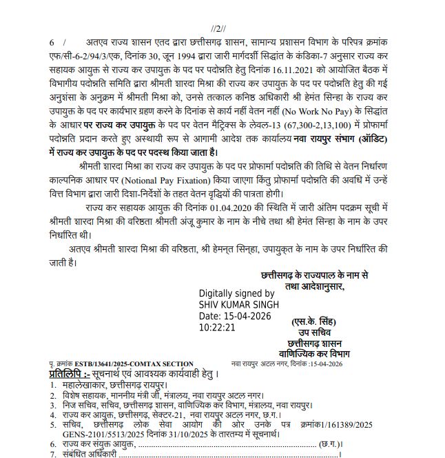 रायपुर : छत्तीसगढ़ राज्य के वाणिज्यिक कर (GST) विभाग में प्रशासनिक स्तर पर महत्वपूर्ण पदोन्नति करते हुए असिस्टेंट कमिश्नर शारदा मिश्रा को डिप्टी कमिश्नर के पद पर पदोन्नत किया गया है। पदोन्नति के साथ ही उन्हें नया रायपुर (अटल नगर) संभाग-1 में ऑडिट कार्य की महत्वपूर्ण जिम्मेदारी सौंपी गई है।