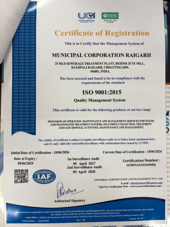 रायगढ़ : नगर निगम रायगढ़ के लिए यह गौरव का विषय है कि शहर के 25 एमएलडी एवं 7 एमएलडी सीवरेज ट्रीटमेंट प्लांट (एसटीपी) को अंतरराष्ट्रीय स्तर का ISO 9001:2015 (क्वालिटी मैनेजमेंट सिस्टम) प्रमाण पत्र प्राप्त हुआ है। इसके साथ ही रायगढ़ नगर निगम के दोनों एसटीपी के नाम प्रदेश का पहला आईएसओ प्रमाणीकरण का ताज सज गया है। यह उपलब्धि नगर निगम आयुक्त बृजेश सिंह क्षत्रिय के कुशल मार्गदर्शन, सतत निगरानी एवं टीम के समर्पित प्रयासों का परिणाम है। नगर निगम द्वारा संचालित दोनों एसटीपी से जल एवं अपशिष्ट जल प्रबंधन प्रणाली, जिसमें संग्रहण, उपचार (ट्रीटमेंट) एवं सुरक्षित निस्तारण की समस्त प्रक्रियाओं को शामिल किया गया है। यह अंतरराष्ट्रीय गुणवत्ता मानकों पर खरी उतरी हैं। टीवी टावर क्षेत्र बड़े अतरमूड़ा स्थित 7 एमएलडी एसटीपी तथा बांझीनपाली स्थित 25 एमएलडी सीवरेज ट्रीटमेंट प्लांट दोनों को यह प्रमाणन प्रदान किया गया है।