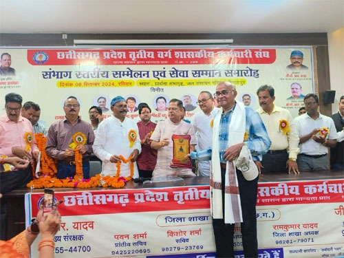 राजनांदगांव: छत्तीसगढ़ प्रदेश तृतीय वर्ग शासकीय कर्मचारी संघ (पंजीयन क्रमांक-249) का बिलासपुर संभाग स्तरीय कर्मचारी सम्मेलन एवं सेवा-सम्मान समारोह अमर अग्रवाल शहर विधायक एवं पूर्व मंत्री छत्तीसगढ़ शासन संघ के मुख्य आतिथ्य में संपन्न हुआ, जिसकी अध्यक्षता संघ के प्रदेश प्रमुख जीआर चंद्रा ने की। कार्यक्रम के विशिष्ट अतिथि संरक्षक पीआर यादव एवं अवधेश शुक्ला प्रांतीय महामंत्री थे।