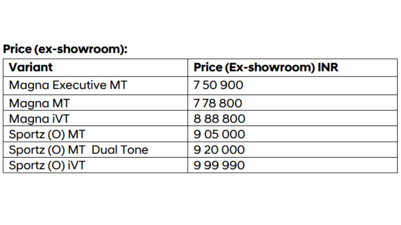 हुंडई की ओर से आई-20 के Magna Executive वेरिएंट की एक्स शोरूम कीमत 7.50 लाख रुपये से शुरू की गई है और इसके टॉप वेरिएंट Magna iVT 8.89 लाख रुपये में ऑफर किया गया है। वहीं Sports (O) वेरिएंट की एक्स शोरूम कीमत 9.05 लाख रुपये से 9.99 लाख रुपये के बीच रखी गई है।