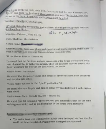 मुर्शिदाबाद में हिंदुओं के घर में रखे सभी कपड़ों को जला दिया गया, ताकि घर की महिलाओं के पास अपने शरीर को ढकने के लिए कुछ भी न बचे।पश्चिम बंगाल के मुर्शिदाबाद में हिंदुओं को चुन-चुन कर निशाना बनाया गया। कलकत्ता हाई कोर्ट द्वारा गठित जाँच समिति ने भी अपनी विस्तृत रिपोर्ट में इस हिंसा की क्रूरता को उजागर किया है, जिसमें सत्ताधारी तृणमूल कॉन्ग्रेस (TMC) के पार्षद और विधायक की संलिप्तता की बात सामने आई है। यह हिंसा वक्फ संशोधन बिल के पास होने के दौरान शुरू हुई, जिसके विरोध की आड़ में हिंदुओं को निशाना बनाया गया। हिंदुओं के घरों को फूँकने के बाद उन घरों के पानी के कनेक्शन भी काट दिए गए, ताकी जलते घरों की आग को बुझाया न जा सके।