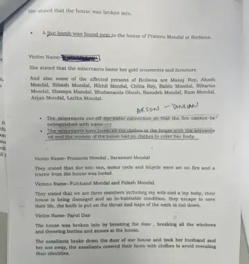प्रतिमा मंडल (बेटबोना): प्रतिमा मंडल ने बताया कि उनके घर के पास एक जिंदा बम पाया गया था। हमलावरों ने उनके घर से सोने के गहने और फर्नीचर लूट लिया। इस हमले में कई अन्य प्रभावित लोग भी शामिल हैं। हमला पीड़ितों मनोज रॉय, आकाश मंडल, बिकाश मंडल, निखिल मंडल, चित्ता रॉय, बाबूल मंडल, निबारून मंडल, शम्पा मंडल, भबानंदा घोष, बसुदेब मंडल, राम मंडल, अर्जुन मंडल और लतिका मंडल शामिल हैं।