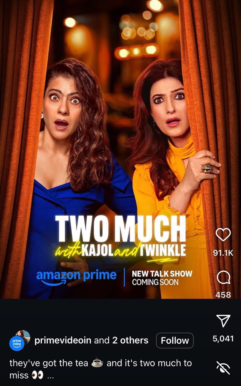 बॉलीवुड निर्माता करण जौहर का कॉफी विद करण ओटीटी की दुनिया का सबसे शानदार टॉक रहा है। अब इस क्रम को करण की दोस्त काजोल और ट्विंकल खन्ना आगे बढ़ाने के लिए तैयार हैं। 22 जुलाई को टू मच की ऑफिशियल अनाउंसमेंट ओटीटी प्लेटफॉर्म अमेजन प्राइम वीडियो की तरफ से कर दी गई है। शो का पहला पोस्टर भी सामने आया है।