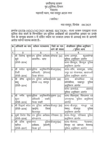 रायपुर : छत्तीसगढ़ सरकार ने पुलिस और प्रशासनिक प्रणाली को सुदृढ़ करने के उद्देश्य से बड़े पैमाने पर फेरबदल करते हुए 11 DSP का ट्रांसफर (DSP Transfer) किया है। इसके अलावा राज्य प्रशासनिक सेवा के दो अधिकारियों को अतिरिक्त जिम्मेदारी सौंपी गई है।