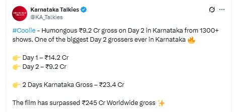 रजनीकांत की कूली दुनियाभर में गदर मचा रही है। पहले ही दिन इंडिया में मूवी ने 55 करोड़ से ज्यादा की ओपनिंग की थी। वहीं वर्ल्डवाइड फिल्म ने 150 करोड़ से ज्यादा की ओपनिंग करके कई फिल्मों का लाइफटाइम रिकॉर्ड ब्रेक किया था। अब दूसरे दिन भी फिल्म का सिक्का दुनियाभर में चल गया। कर्नाटक टॉकीज की रिपोर्ट्स के मुताबिक, कूली ने दूसरे दिन सिंगल डे यानी कि स्वतंत्रता दिवस की छुट्टी पर वर्ल्डवाइड 100 करोड़ के आसपास का बिजनेस किया है।