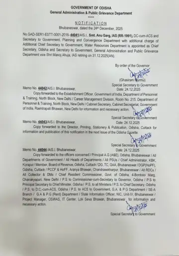 भुवनेश्वर: वरिष्ठ भारतीय प्रशासनिक सेवा (आईएएस) अधिकारी अनु गर्ग को बुधवार, 24 दिसंबर को ओडिशा का नया मुख्य सचिव नियुक्त किया गया है। ओडिशा कैडर के 1991 बैच के आईएएस अधिकारी अनु गर्ग, निवर्तमान मुख्य सचिव मनोज आहूजा का स्थान लेंगे।ओडिशा सरकार की अधिसूचना के अनुसार, आहूजा 31 दिसंबर को सेवानिवृत्त हो रहे हैं, इसलिए गर्ग नए साल में नए पदभार ग्रहण करेंगे।