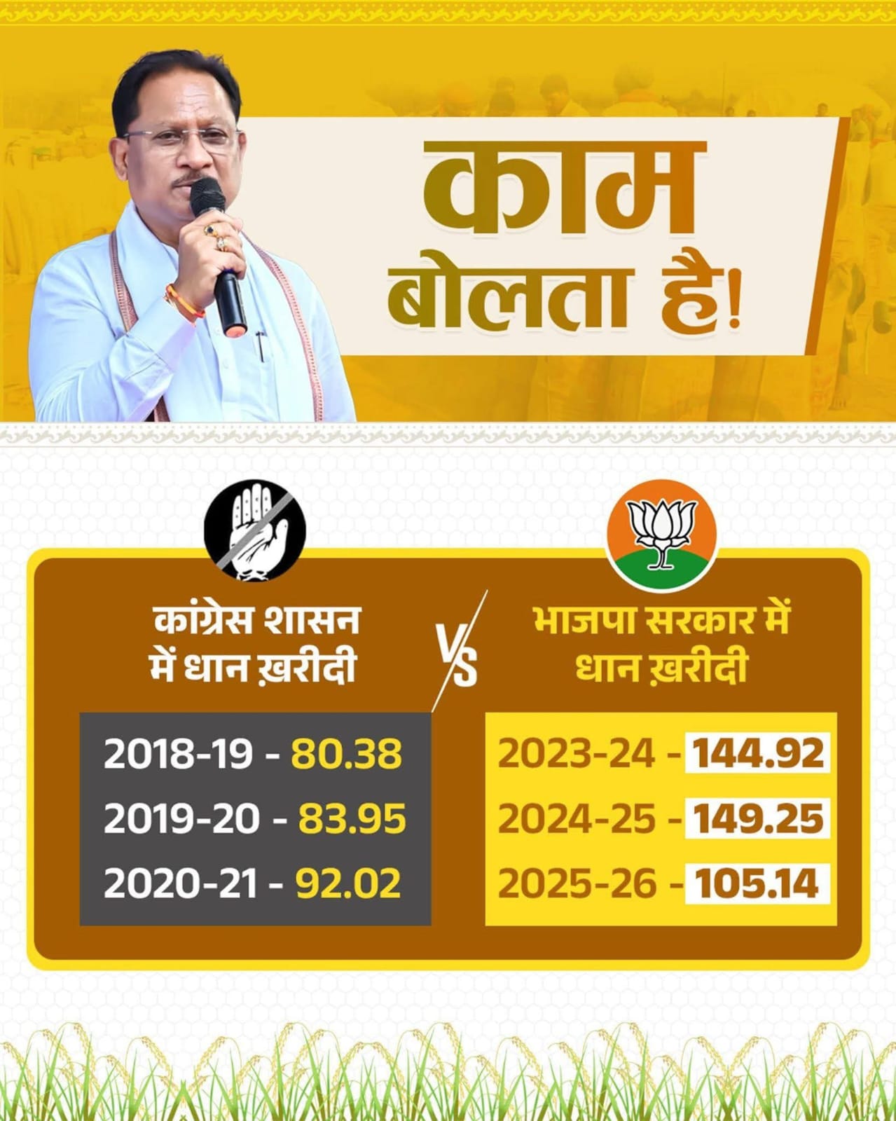 जिस कार्यकाल में सॉफ्टवेयर गड़बड़ी कर 37 हजार रकबा शून्य कर दिया गया था और किसानों को भारी परेशानियों का सामना करना पड़ा प्रदेश किसान परेशान थे और नाराज किसानों ने ही भूपेश बघेल की कुर्सी गिराने में बड़ी भूमिका निभाई Iपिछले भूपेश सरकार में कस्टम मिलिंग का रेट बढ़ाया गया और राइस मिलरो को पैसा नहीं मिला राइस मिलर परेशान रहे , भ्रष्टाचार चरामसीमा था प्रदेश की जनता नान घोटाला को नहीं भूली है जिसके आरोपी तात्कालिक चेयरमेन आज तक फरार है कांग्रेसियों के झूठे आरोप से किसानो का कोई सरोकार नहीं है भूपेश सरकार में धान सुखत का अडका 6.32 था जो अब साय सुशासन में घट कर 3.49 है ! हमारी सरकार अन्नदाताओं का एक-एक दाना खरीदने के लिए तैयार है जरूरत पड़ी तो धान खरीदने के समय सीमा को बढ़ाया जाएगा वहीं कहा कि