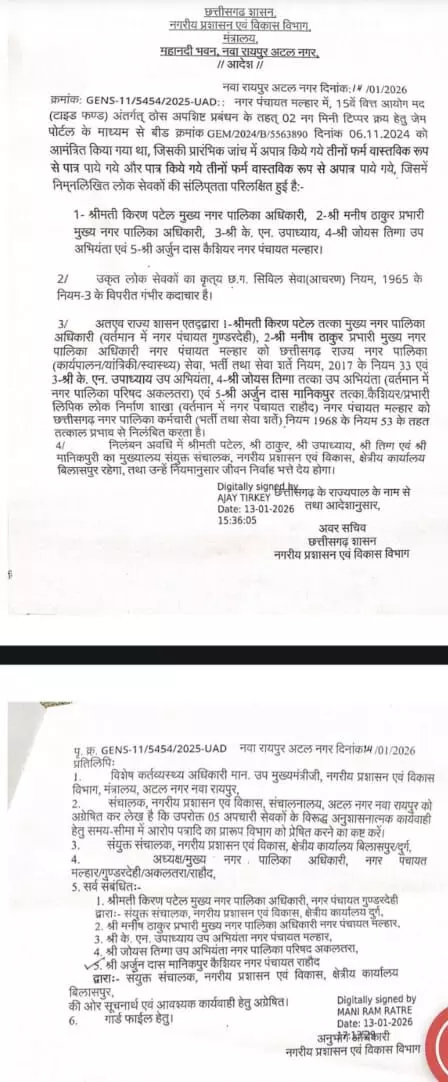 बिलासपुर जिले के नगर पंचायत मल्हार में ठोस अपशिष्ट प्रबंधन के लिए 2 नग मिनी टिप्पर क्रय के प्रकरण में गड़बड़ी करने पर छत्तीसगढ़ शासन, नगरीय प्रशासन एवं विकास विभाग ने अधिकारियों को तत्काल प्रभाव से निलंबित करने की कार्यवाही की गई है। यह कार्रवाई 15वें वित्त आयोग मद (टाइड फंड) के तहत किए गए ठेके में फर्मों की पात्रता जांच में गड़बड़ी मिलने के बाद की गई। 6 नवंबर 2024 को निविदा के माध्यम से आमंत्रित फर्मों की प्रारंभिक जांच में तीन अपात्र फर्मों को पात्र और तीन पात्र फर्मों को अपात्र कर दिया गया। निलंबित अधिकारियों में तात्कालीन मुख्य नगर पालिका अधिकारी किरण पटेल ( वर्तमान में नगर पंचायत गुंडरदेही), प्रभारी मुख्य नगर पालिका अधिकारी मल्हार मनीष ठाकुर, उप अभियंता के. एन. उपाध्याय, उप अभियंता जोयस तिग्गा ( वर्तमान में नगर पालिका अकलतरा) और तत्कालीन कैशियर/ प्रभारी लिपिक लोक निर्माण शाखा अर्जुन दास( वर्तमान में नगर पंचायत राहौद) शामिल हैं।