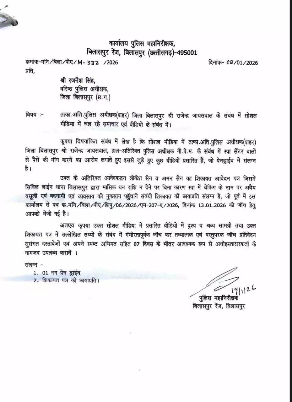 शिकायत को संज्ञान में ले आईजी डॉक्टर संजीव शुक्ला ने एसएसपी बिलासपुर रजनेश सिंह को जांच के निर्देश दिए हैं। आईजी के निर्देश में कहा गया है कि तत्कालीन एडिशनल एसपी राजेंद्र जायसवाल वर्तमान में जीपीएम के संबंध में स्पा वालो से पैसे मांगने के वीडियो प्रसारित हुए हैं,जो पेन ड्राइव में संलग्न है। इसके अलावा लोकेश सेन और अमन सेन जी का शिकायत आवेदन पत्र जिसमें मासिक रकम न देने के चलते बिना कारण चेकिंग और व्यवसाय को बदनाम करने की शिकायत संलग्न है। इस संबंध में गंभीरता पूर्वक जांच कर सात दिन में जांच प्रतिवेदन प्रस्तुत किया जाए।