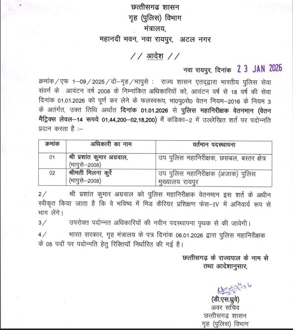 आदेश में यह भी उल्लेख है कि प्रशांत कुमार अग्रवाल को भविष्य में मिड करियर प्रशिक्षण के फेज-IV में अनिवार्य रूप से भाग लेना होगा। पदोन्नत अधिकारियों की नई पदस्थापना के आदेश पृथक से जारी किए जाएंगे।