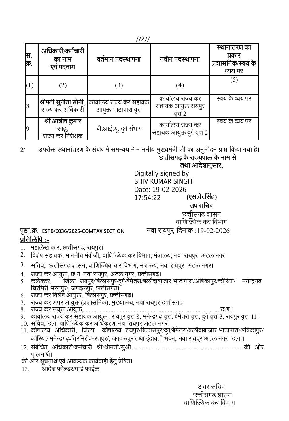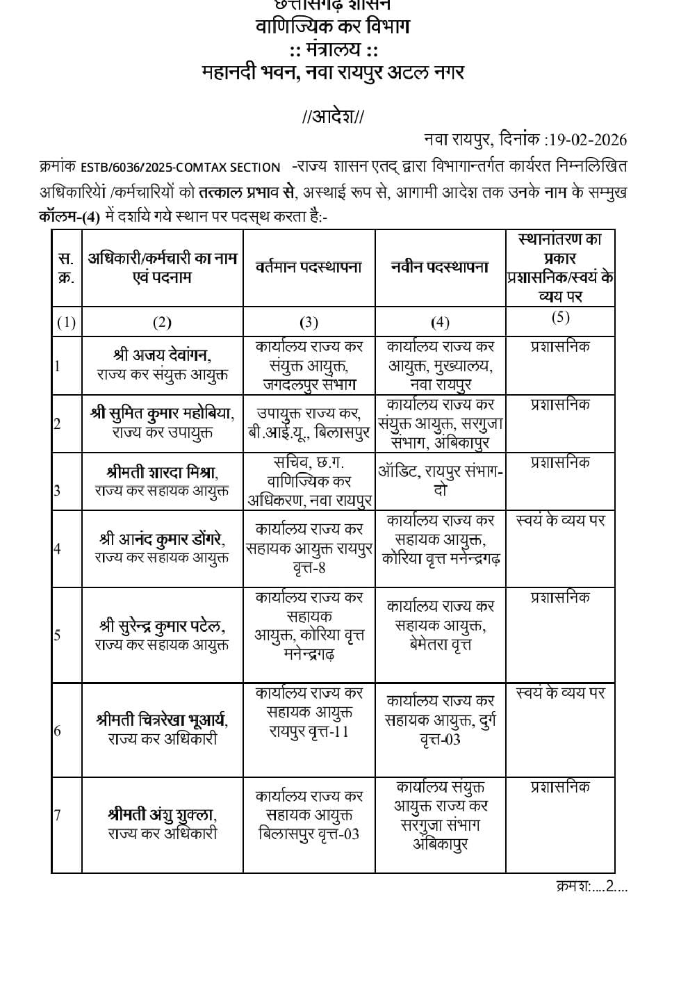 रायपुर : वाणिज्य एवं कर विभाग में अधिकारियों का स्थानांतरण किया गया है नवीन पदस्थापना के लिए देखें सूची