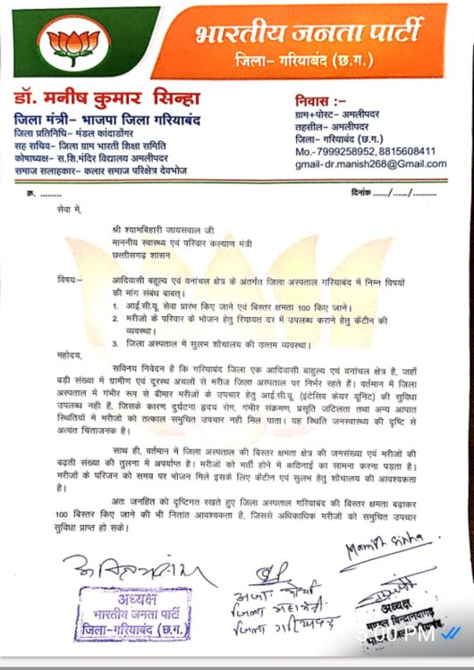 भेंट के दौरान गरियाबंद जिला अस्पताल के समग्र विकास का मुद्दा प्रमुखता से उठाया गया। प्रतिनिधिमंडल ने बताया कि आदिवासी एवं वनांचल क्षेत्र होने के कारण बड़ी संख्या में ग्रामीण एवं दूरस्थ अंचलों के मरीज जिला अस्पताल पर निर्भर हैं, किंतु वर्तमान 50 बिस्तरों की क्षमता क्षेत्र की आवश्यकताओं के अनुरूप नहीं है। इस पर अस्पताल की क्षमता बढ़ाकर 100 बिस्तर किए जाने की जोरदार मांग रखी गई, ताकि मरीजों को समय पर भर्ती और समुचित उपचार मिल सके। साथ ही आपातकालीन चिकित्सा सेवाओं को सुदृढ़ करने हेतु इमरजेंसी केयर आईसीयू (Emergency Care ICU) की स्थापना का विषय भी विस्तार से रखा गया। प्रतिनिधिमंडल ने तर्क दिया कि आईसीयू सुविधा उपलब्ध होने से गंभीर दुर्घटना, हृदय रोग, संक्रमण और अन्य जटिल मामलों में मरीजों को तत्काल उपचार मिल सकेगा और उन्हें रायपुर अथवा अन्य बड़े शहरों में रेफर करने की मजबूरी कम होगी।