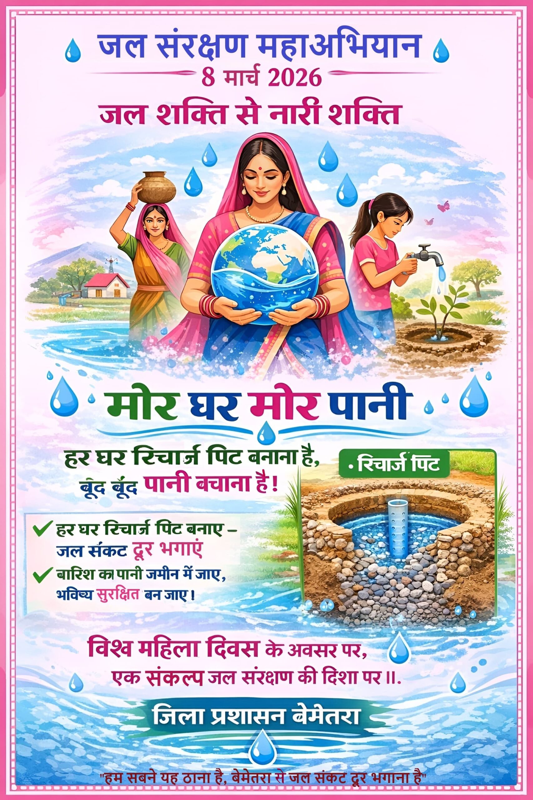 विश्व महिला दिवस के अवसर पर यह केवल एक अभियान नहीं, बल्कि भविष्य को सुरक्षित करने का संकल्प है। आइए, हम सब मिलकर यह प्रण लें हम जल की एक-एक बूंद बचाएंगे, वर्षा जल का संरक्षण करेंगे, रिचार्ज पिट का निर्माण करेंगे, और बेमेतरा को जल संकट से मुक्त बनाएंगे।” 08 मार्च 2026 को अपने घर में रिचार्ज पिट बनाकर महिलाओं के सम्मान में जल संरक्षण का संकल्प लें। यही सच्ची श्रद्धांजलि होगी प्रकृति, मातृशक्ति और आने वाली पीढ़ियों के प्रति।