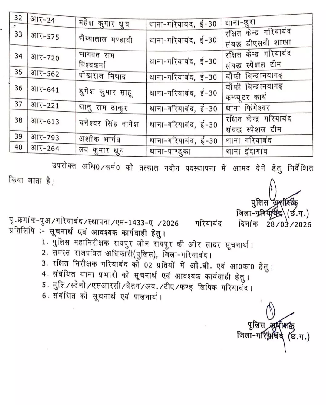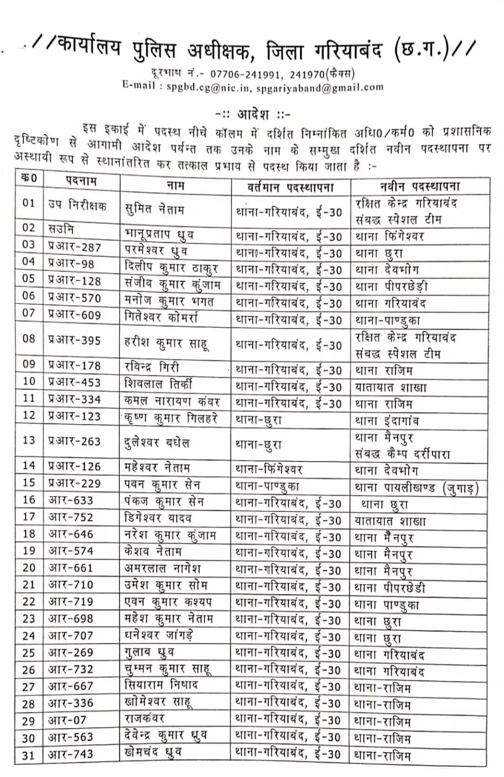 गरियाबंद: छत्तीसगढ़ के गरियाबंद जिले में 40 पुलिसकर्मियों की ट्रांसफर लिस्ट जारी की गई है। सूची में एक एसआई, 1 सहायक उप निरीक्षक, 13 हेड कांस्टेबल और 25 आरक्षक के नाम शामिल है।